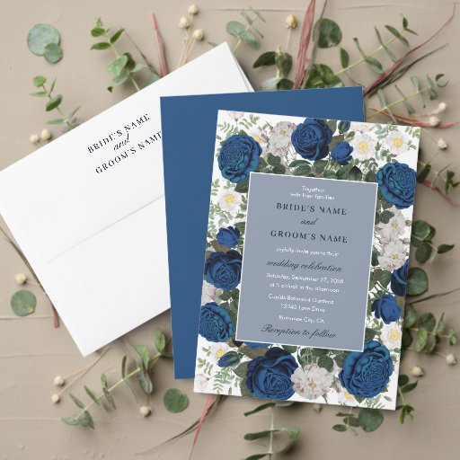 Modernes Hochzeitsdesign in Blau und Weiß mit Aquarellfarben-Blume. Dieses moderne Hochzeitsdesign ist ideal für alle Jahreszeiten, Frühjahr, Sommer, Herbst und Winter. Eine elegante Blau-Weiß Rosen und ihre grüne Aquarellbilderstruktur. Ein klassisch blühendes Hochzeitsmenü mit modernem elegantem Design. Auch die passenden Hochzeitseinladungen und andere Schreibwaren sind verfügbar.