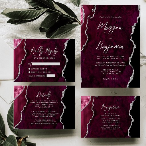 Modern Burgundy Agate Silver Script Wedding EinladungModern Burgundy Agate Silver Script Wedding Einladung (Vorderseite)Modern Burgundy Agate Silver Script Wedding Einladung (Rückseite)
