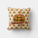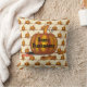 Modernes, stilvolles THROW PILLOW mit orangefarbenem PUMPKIN-Muster vor warmen Cremes. In der Mitte befindet sich ein großer Kürbis, der sagt: "GLÜCKLICH DANKSGIVING" (das ist anpassbar, sodass Sie durch Ihren Namen oder Gruß ersetzen können). Ideal für Erntedank-Wohngestaltung-Updates, auch geeignet für Geburtstage, Weihnachten, Ostern und Feiertage. Teil der ERNTEDANK Collection von Berean Designs.