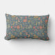 This rectangular throw pillow features stylized flowers in shades of coral and olive green on a denim blue background.