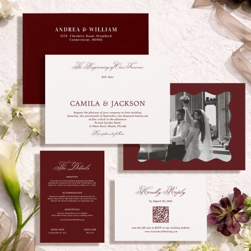 Modern Ivory and Burgundy Wedding RSVP Qr Code Begleitkarte