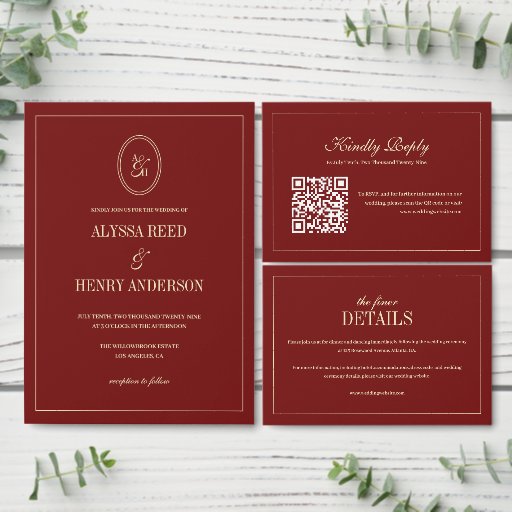 Modern Monogram Classic Wine Red Wedding Invitation. Personalize this elegant dark wine red and cream wedding invitation with bride and groom names and initials, your wedding date, and location.