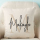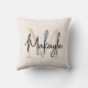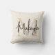 This modern throw pillow features a monogram and name in stylish script calligraphy on a neutral beige background. It is easily customizable.