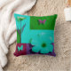 This modern floral pillow showcases oversized pink flowers set against bold, geometric color blocks.