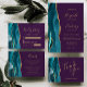 Der links Rand dieser eleganten, modernen Hochzeitseinladung zeichnet sich durch eine aquamarine Aquarellgrenze aus, die mit Imitaten mit goldenem Glitzer bestickt wurde. Der anpassbare Text kombiniert goldfarbene Handschrift, Copperplate und kursive Schriftart auf einem opulenten, tiefen lila Hintergrund. Auf der Rückseite ist ein aquamarines und goldenes Design zu sehen.