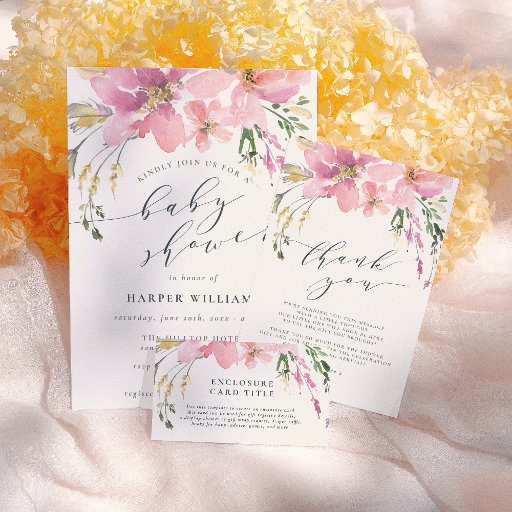 Dieses zeitlose Babyduschdesign mit "Oh baby!" in einem eleganten Schriftart, Ihre Duschdetails in einer formalen Typografie und einem Rahmen von Aquarellfarben-Blume in Rosa und lila. Passen Sie diese Einladungen an, indem Sie den Text in den Vorlagenfeldern ändern.