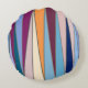 Rundkissen in einem modernen, geometrischen Muster länglicher Dreiecke, in den Farbtönen Blau, Auberginen lila und Lila, mit goldgelben, aquamarinen Akzenten, Marine- und Cremeakzenten
