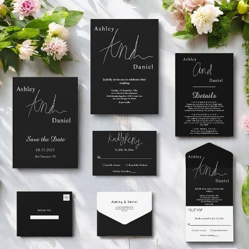 Diese elegante Schwarz-Weiß-Hochzeit bewahrt das Datum und ist perfekt für eine moderne Hochzeit. Das schlichte Design mit eleganter weißer Kalligraphie auf schwarzem Hintergrund.