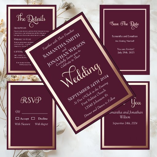Diese schicke Hochzeitskollektion besticht durch moderne Typografie der Kalligraphie. Es hat einen einfachen Goldrahmen aus der Rose. Diese Rose Gold auf trendigem lila Set ist einfach, aber elegant und trendig.