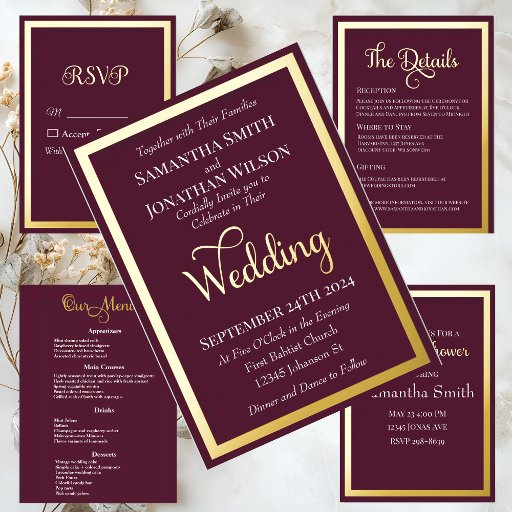 Diese schicke Hochzeitskollektion besticht durch moderne Typografie der Kalligraphie. Es hat einen einfachen Goldrahmen aus der Rose. Dieses Gold auf dem trendigen lila Set ist einfach, aber elegant und trendig.