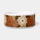 Eine Schüssel mit Tee in moderner Form in einem traditionellen japanischen Kimono-Blumendruck - stilisierte Blume in Taupe-Bräune, Rostbraun und Beige auf dunkelschokoladenbraunem Hintergrund