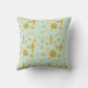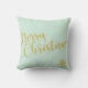 Moderne, hellblaue Typografie Drehbuch Frohe Weihnachten saisonale dekorative Akzente Kissen mit einem goldblauen Schneeflocken und Baumschmuck Muster auf der Rückseite.