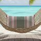 Dieses Kissen aus Lendenwirbel im Freien weist senkrechte Streifen verschiedener Breiten in Weiß, Weiß und Grau in Weiß, Weiß, Weiß und Hellgrün auf. Ein ideales Sommermuster für Patio, Deck oder Veranda.