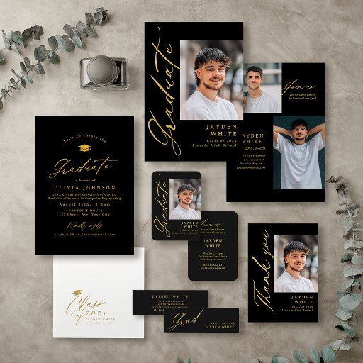 Modernes Kalligraphie-Design mit Graduierungsmütze und Fotos vorne und hinten, einfach und einzigartig. Personalisierte Dankeschön-Karte für die Abschlussfeier.