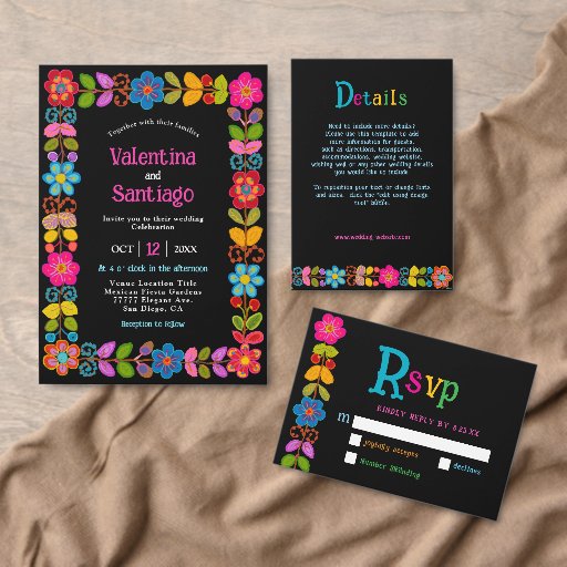 Feiern Sie Ihre Liebe mit kühner Eleganz mit dieser modernen mexikanischen All-in-One Hochzeitsfeier. Das Design ist mit einem lebendigen, von der mexikanischen Volkskunst inspirierten Blumenrahmen gestaltet und strahlt Rot-, Gelb-, Rosa- und Türkisfarben aus. Das Set ist in einem auffallenden schwarzen Hintergrund gehalten. Dieses All-in-One-Format verbindet Ihre Einladung und Ihre Abriss-UAWG in einem nahtlosen Design - sowohl praktisch als auch wunderschön miteinander. Die farbenfrohe Blumengrenze bringt festlichen Charme und kulturelle Wärme, während eine saubere, moderne Typografie eine Touch von Eleganz schafft. Ideal für Paare, die eine stilvolle, lebendige Einladung gewollt haben, die einen bleibenden Eindruck hinterlässt.