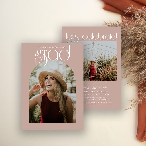 Die Zukunft sieht hell aus mit diesen modernen und trendigen staubigen rosa Graduierungs-Party Einladungen feiern die Klasse von 2023 Fügen Sie Ihre personalisierten Informationen und 2 Fotos der Wahl auf der Vorder-und Rückseite der Karte. Ideal für Hochschul-, Uni- und/oder Universitätsfeiern.