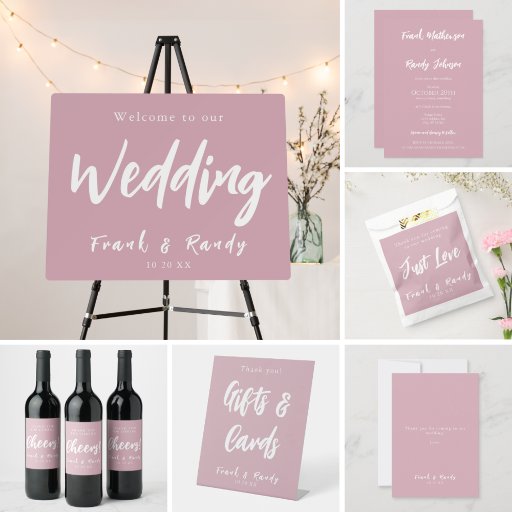 Modernes, einfaches und minimalistisches Dankeschön an Geschenke und Karten Hochzeitszeichen. Anpassbare staubige Rose rosa Hintergrund mit weißer Typografie. Enthält die Namen und das Datum der Hochzeit. Herzlichen Glückwunsch zu Ihrer Hochzeit!