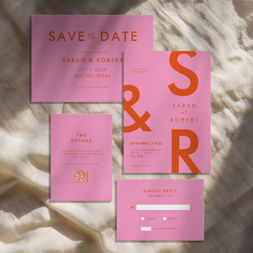 Moderne Minimalistisch rosa orangefarbene Hochzeitskarten. Features einfache Typografie und minimales grafisches Design.