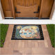Willkommen Doormat mit der modernen Ingwer-Hair Prinzessin mit Diadem am Strand, die Hand mit ihrem Prinzen und kleine Mädchen werfen Blume - Happy Family Doormat gerahmt im Art Nouveau Stil mit Pfau und Rose. Fantastisches Kunstgeschenk für Ihr Strandhaus, frisch gezapftes Paar, Familienjubiläum. Passen Sie den Text auf den Seiten einfach an.