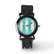 Diese moderne Raute Kid's Watch aus dem Mittelalter besticht durch einen lebendigen, türkisfarbenen Hintergrund und ein Muster aus Mod, lichtdurchlässigen aquamarinen Diamanten, die größere, Vintage Diamanten mit goldfarbenen, weltraumzeitalterlichen Fesseln überlagern. Diese minimalistisch inspiriert, dekonstruierte Raute ist eine vereinfachende Rückgabe der größeren als der Lebensatomärzeit, die die Dekorationslandschaft der 1950er und 1960er Jahre dominierte. Dieses kitschige Design erinnert an alles, von den Retro-Bowling-Gassen-Schildern von Palm Springs bis zu den Fernsehfächern, die Sie bei Ihrer Großmutter benutzt haben.