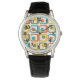 Die Armbanduhr dieses Mannes hat ein modernes Design von vier abgerundeten Rechtecken in vier Reihen mit Ovalen in orange, gelb, grün und türkis.