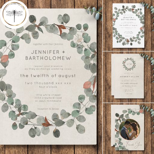 Dieses einladende Hochzeitsdesign zeichnet sich durch ein großes, einfaches, weiches Aquarellgrün und einen Rosteukalyptuskranz auf einem Vintagen, bedrückten cremefarbenen Hintergrund aus. Die Rückseite ist eine einfache Rost-Terrakotta-Farbe. Erstellt von der einfachen Farmhouse Press.