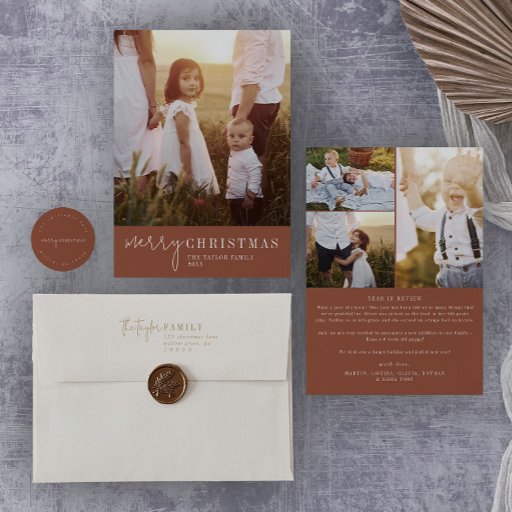 Diese moderne, schicke Terracotta Merry Christmas Foto-Urlaubskarte ist die perfekte stilvolle Begrüßung für Ihren Urlaub. Dieses schlichte Boho-Design zeichnet sich durch klassische, raffinierte Kalligraphie in rustikal böhmisch verbrannten Orange und Weiß aus. Personalisieren Sie die Kartenvorderseite mit einem Foto, Ihrem Familiennamen und dem Jahr.