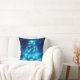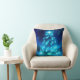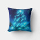 Ein Kissen mit einem modernen elektrischen blauen Weihnachtsbaum. Das Ganze ist mit Lichtern geschmückt. Der Hintergrund ist verschwommen.