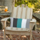 Moderne, gestreifte Outdoor-Lumbalkissen in aquamarinem Blau, dunkelgrau und hellgrau, schwarz und weiß.