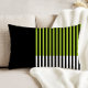 Dieses moderne Kissen ist in großen rechteckigen, grün, schwarz und weiß gestrichenen Blöcken gehalten, die mit schwarzen Streifen auf den grünen und weißen Kalkflächen verziert sind.