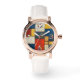 Die modische Ladys watch zeichnet sich durch ein lebendiges Muster in Orange, Gelb und Blau aus, das durch die künstlerischen Stilrichtungen de stijl inspiriert wird - holländisch für "The Style", auch Neoplasticismus genannt, und japanisch für zeitgenössische Kunst.