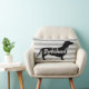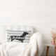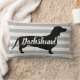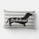 Moderne Würstchen Dackel Hunde Silhouette mit weißem Script Sprichwort "Dackel". Der Hintergrund ist grau gestreift und die Rückseite des Kissens schwarz mit weißen Polka-Punkten.