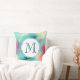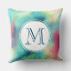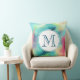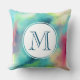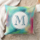 Ein Kissen mit einem coolen und stilvollen abstrakten Design. Wasserfarben mischen sich und mischen sich, um die Illusion eines Raumbildes zu schaffen. Grün mit lila, gelben und hellroten Wirbel und einer Mischung aus weißen Punkten und Sternen. Eine elegante künstlerische Schöpfung. Ein Kreis oben mit dem Monogramm-Initial innen.