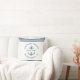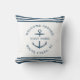 Moderne minimalistische, benutzerdefinierte Bootsnamen werfen Kissen in staubblauem Blau mit nautischen Streifen und Anker lesen WELCOME ABOARD, sowie den Namen der Marina, Dock, Yacht Club, oder Stadt.