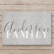 Maßgeschneiderte Türmatte mit personalisiertem Monogramm/Familiennamen in moderner Handkalligraphie auf einem rustikalen Bauernstil Polka-Türrahmen.