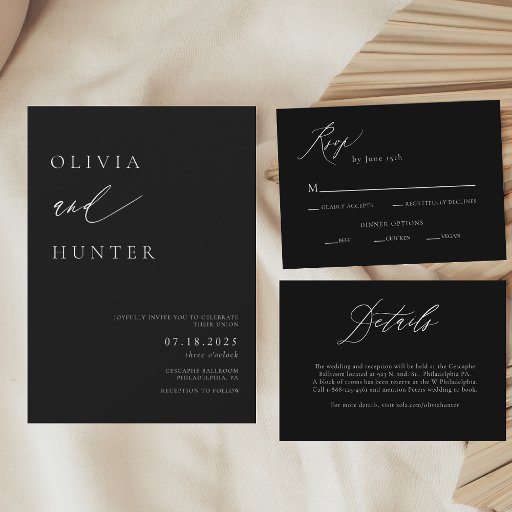 Diese schicke, moderne Schwarz-Weiß-Einladung ist so frisch und neu für 2024 und 2025 Hochzeiten! Es hat ein klassisches Schwarz-Weiß-Thema mit Kalligraphie und Serifentext. Auf der Rückseite befindet sich eine Vorlage für Ihr Lieblings-Verlobung-Session-Foto, ein schwarzer Fleck unten und der passende Name und das entsprechende Hochzeitdatum in der Ecke.