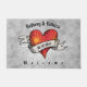 Diese Türmatte ist mit einem Tätowierherz in orangefarbenem und rotem Fraktal Design versehen. Das Herz ist mit einem Band-Banner geschmückt. Es gibt zwei Namen oben und ein Datum auf dem Banner für Sie zu personalisieren. Der Text unten lautet "Willkommen".