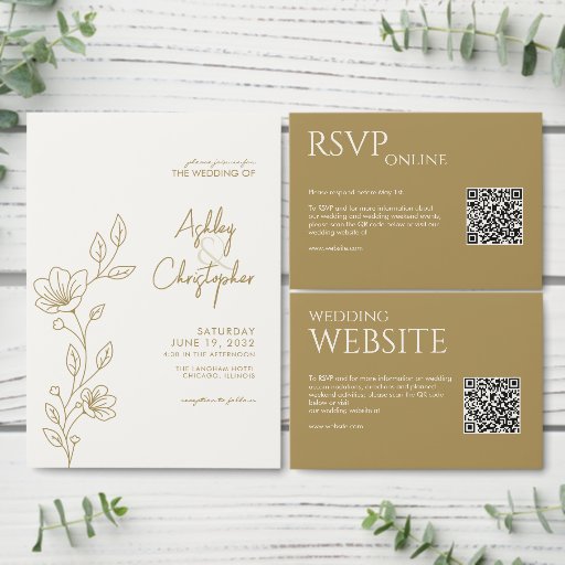 Modernes Gold Foliage Kontur Hochzeitssemble Braut Einladung