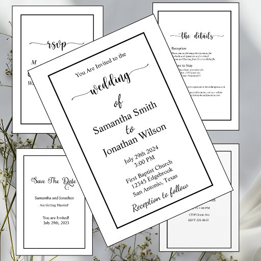 Schauen Sie sich dieses stilvolle und schicke minimalistische Set der Wedding Collection an. Es hat ein modernes Skript mit etwas Kalligraphie. Das einfache Design ist elegant und stilvoll mit einem trendigen zeitgenössischen Look.