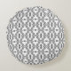 Dekoratives rundes Kissen mit grauem Damast-Muster.