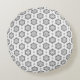 Dekoratives rundes Kissen mit grauem Damast-Muster.