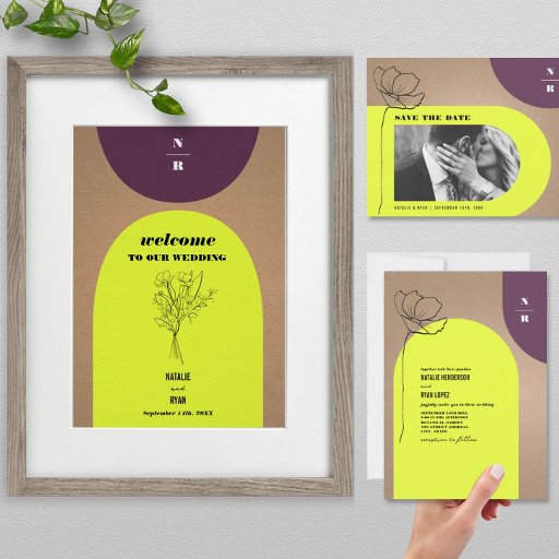 Neongelbe und Pflaumenbögen über inspiriertem Hintergrund. Monogramm oben über Pflaumenbogen. Schwarzer Text über gelbem Bogen mit schwarzer Linie Blume auf verlassen.