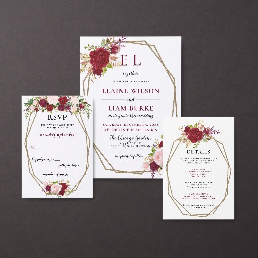 Monografische Hochzeit von Burgundy Blush Gold Flo Einladung