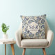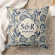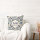Ein Wurfkissen mit einem Vintagen monogramm blauen und cremefarbenen Damast Blumendesign und die Initialen und Hochzeitstag der Braut und Bräutigam.
