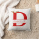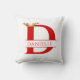 Weihnachts Monogram Letter A Deer Antlers Festive Throw Kissen ist ein zweiseitiges Design. Auf der Vorderseite befindet sich der mit Hirschantlern und einem Kranz aus Blume verzierte Monogramm-Buchstabe D. Es gibt ein Textfeld, das Sie mit Ihrem Namen anpassen können. Die Rückseite ist ein rotes und weißes Streifen
