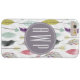 Ein Geschenk mit einem Muster von Abbildungen von Federn mit einem Zickzack Hintergrund. Personalisieren Sie mit Ihrem Monogramm über lila Kreis.