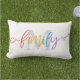 Weiße Kissen im Freien mit einer Familie, die in einem charmanten Drehbuch über Ihren ersten Schatz in einem schmackhaften Lavendel geschrieben wurde. Das Wort Familie ist in den Farben des Regenbogens geschrieben: rot, orange, gelb, grün, blau und lila.