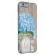 Hübsche blaue HYDRANGEA-Kunstwerke mit Holzzaun, antikem Damast-Muster Spitzen-Hintergrund und geheftetes, blaues Banddesign. Das Mason-Glas mit den Blume kann mit dem ersten und dem ersten Buchstaben Ihrer Monografie mit Monogramm werden. Elegante und feminine rustikale Eleganz, Land, Bauernhof, Gartenhaus, Party oder Barnyard-Stil Details. Entworfen von Chrissy H. Studios, LLC. Alle Rechte vorbehalten.