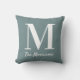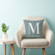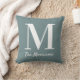 Handgeschriebener Kalligraphiename und großes Monogramm auf pastellfarbenem aquamarinem Kissen für eine klassische Wohngestaltung