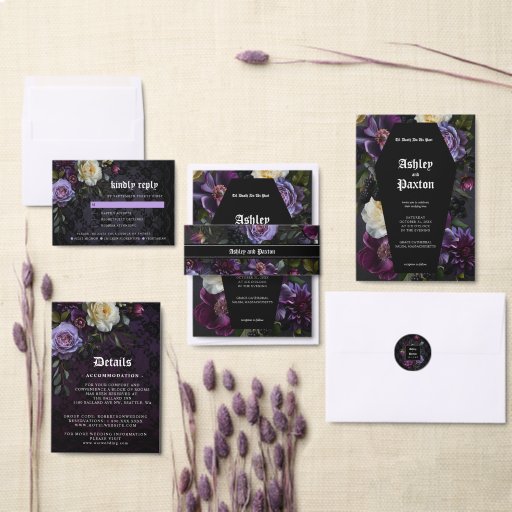 Romantisch und launisch, diese formelle Hochzeitskarte ist perfekt für eine moderne Hochzeit. Das stimmungsvolle Blumendesign besticht durch ein natürliches Bouquet aus lila und staubigen Lavendel-Blume und BlackBerry mit dunkelgrünen Blätter in luxuriösem Ambiente auf dunklem, schwarzem und lila Spitzenhintergrund. Die Rückseite hat ein dunkles Spitzenmuster mit den Namen der Braut und des Bräutigams und dem Hochzeitstag. Alle Einzelheiten der Hochzeit können auf die Bedürfnisse Ihres besonderen Tages angepasst werden.